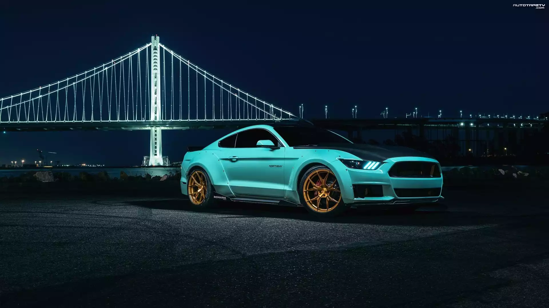 Auto Ford Mustang EcoBoost, Tiffany Blue, 2015, Most, Golden Gate Bridge, San Francisco - Tapeta