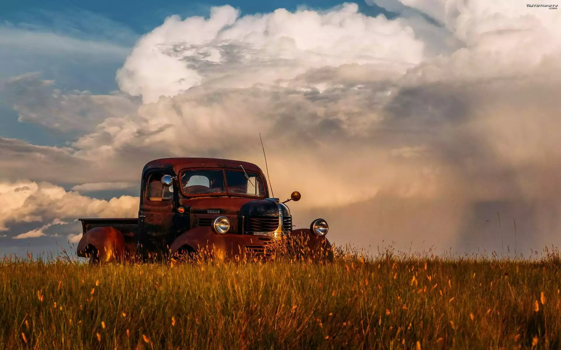 Auto Półciężarówka, Łąka, Chmury - Tapeta