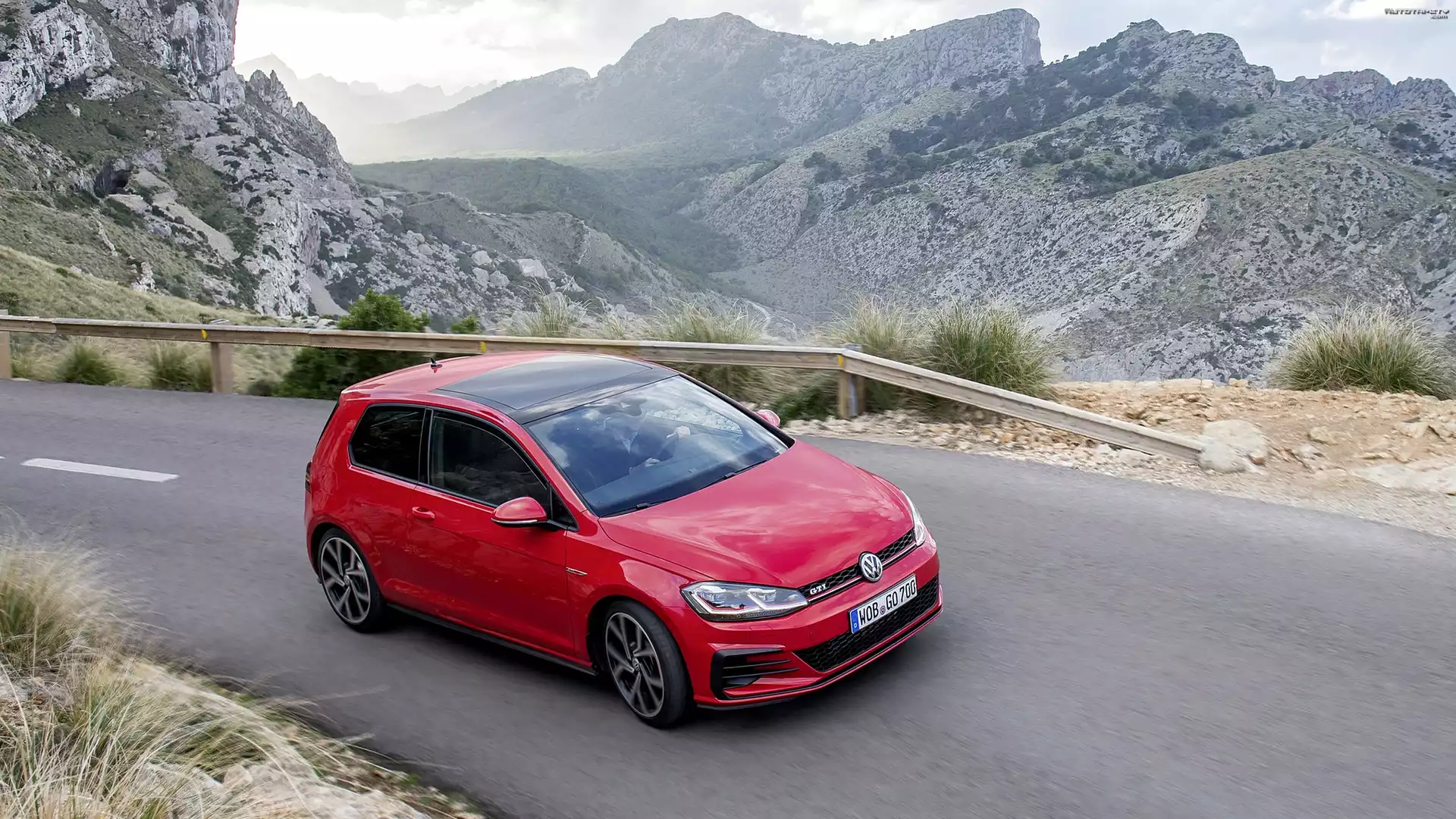 Auto: Czerwony, Vokswagen Golf 7, GTI Facelift, 2017, Góry, Droga, Barierka