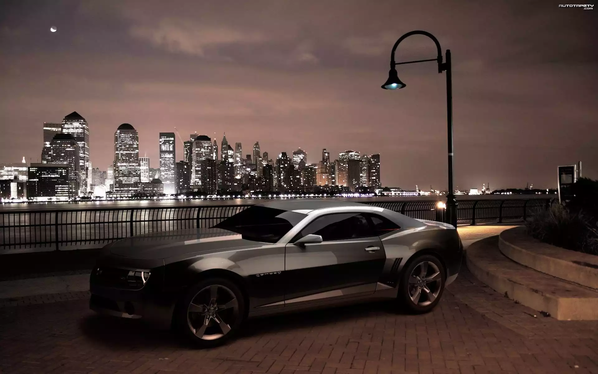 Auto Chevrolet, Camaro, Miasto, Rzeka, Latarnia, Noc - Tapeta