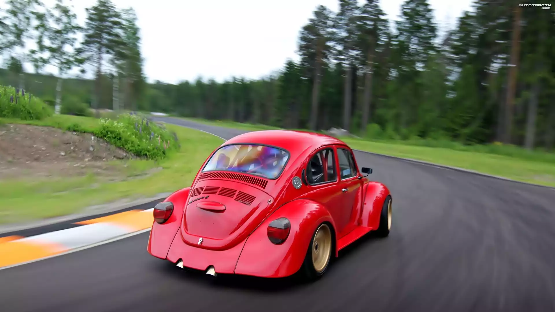 Auto: Czerwony, Volkswagen, Garbus, Droga, Las