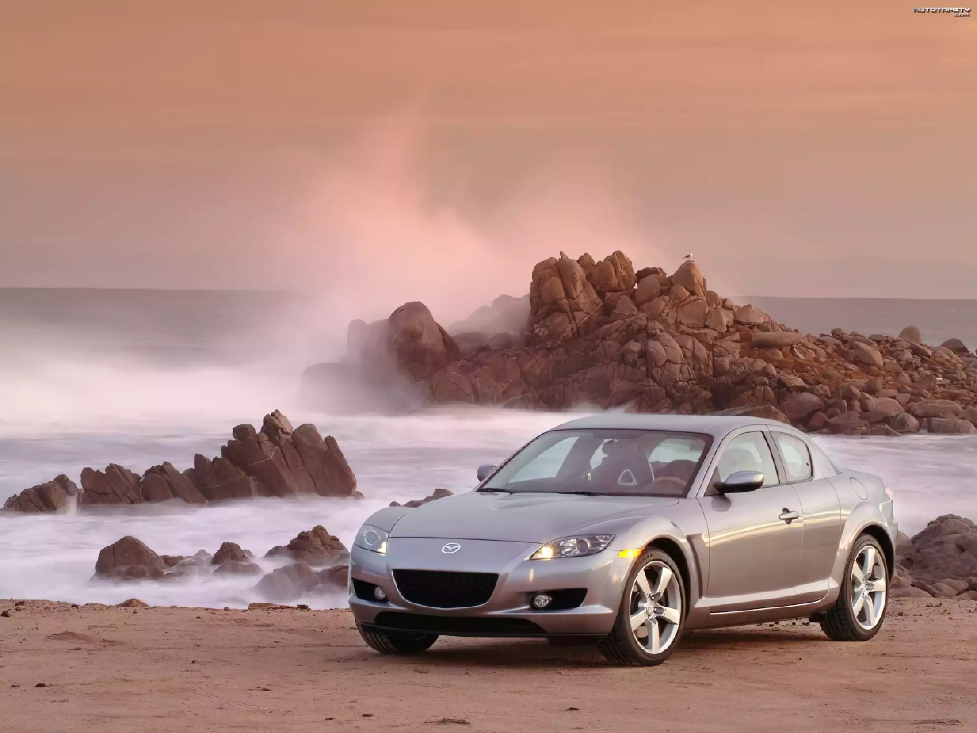 Auto Mazda RX8, Morze, Skały - Tapeta
