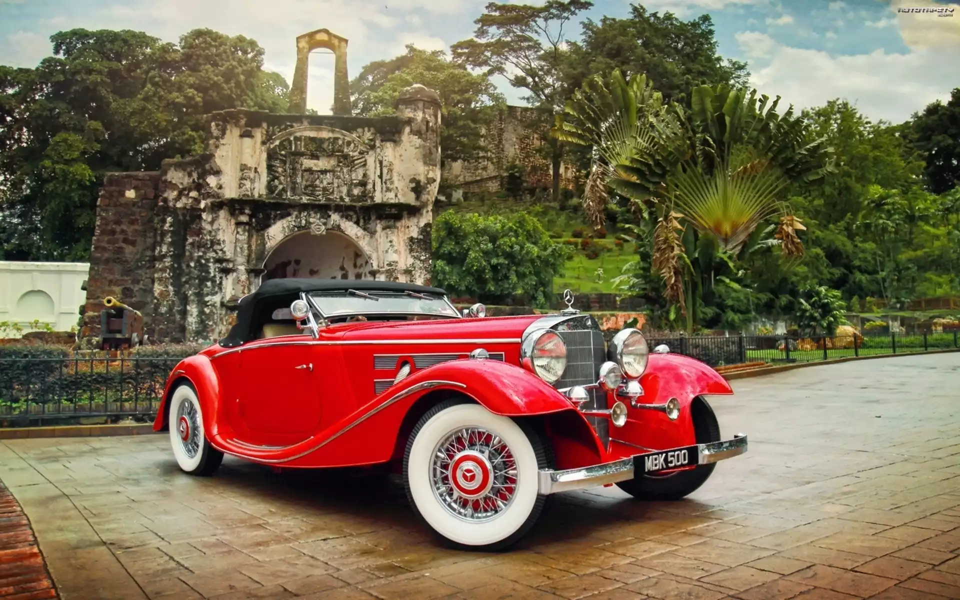 Auto Mercedes, Czerwony, Parking, Drzewa - Tapeta