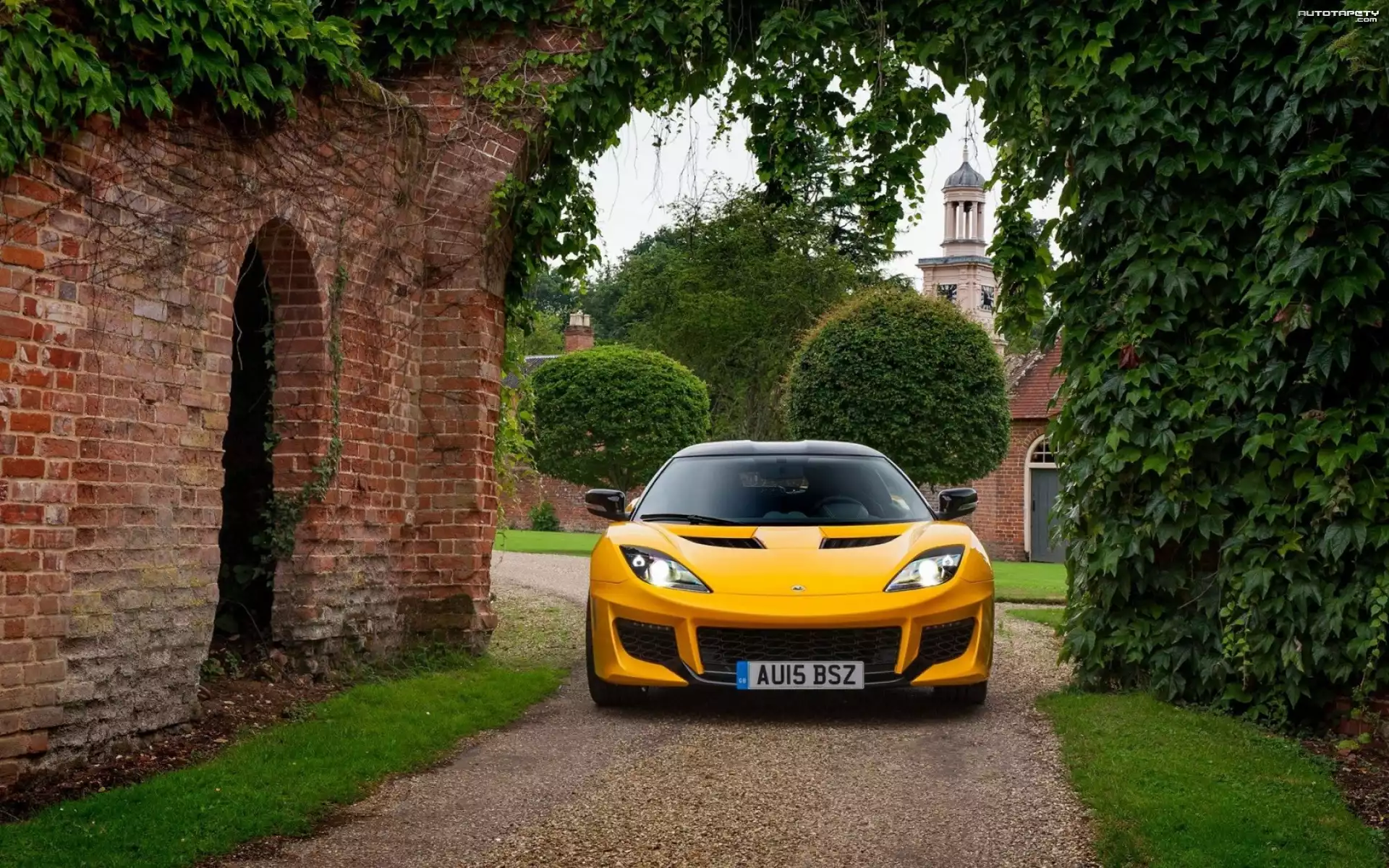 Auto: Żółty, Samochód, Lotus, Evora, Mur, Brama, Droga, Drzewa, Dzika, Winorośl